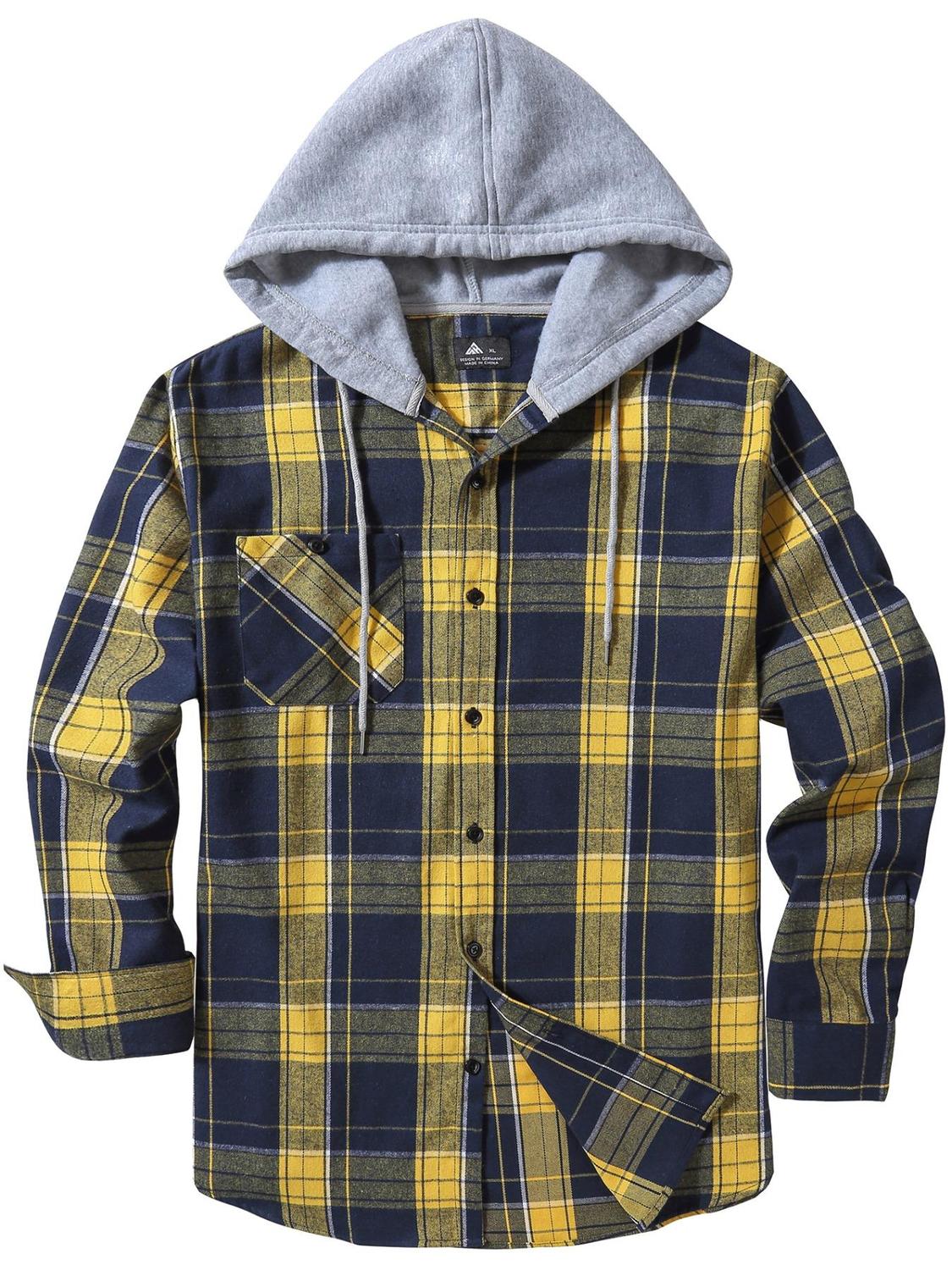 Men’s Plaid Print Button Front Drawstring Hooded Shirt Shirts For Men Back To School Outfits Regular Fit Street Long Sleeve Pocket Hoodie Top Men’s 2000s Shirts Streetwear Errands Outfit Mens Fall Shirts Fall Outfits Earthtone Fallfreshness